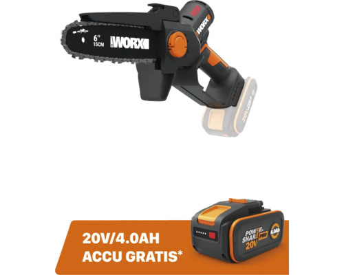 Koop een WORX 20 V machine (excl. accu en lader) en je krijgt er nu een gratis accu (4,0 Ah) ter waarde van € 54,90 bij.