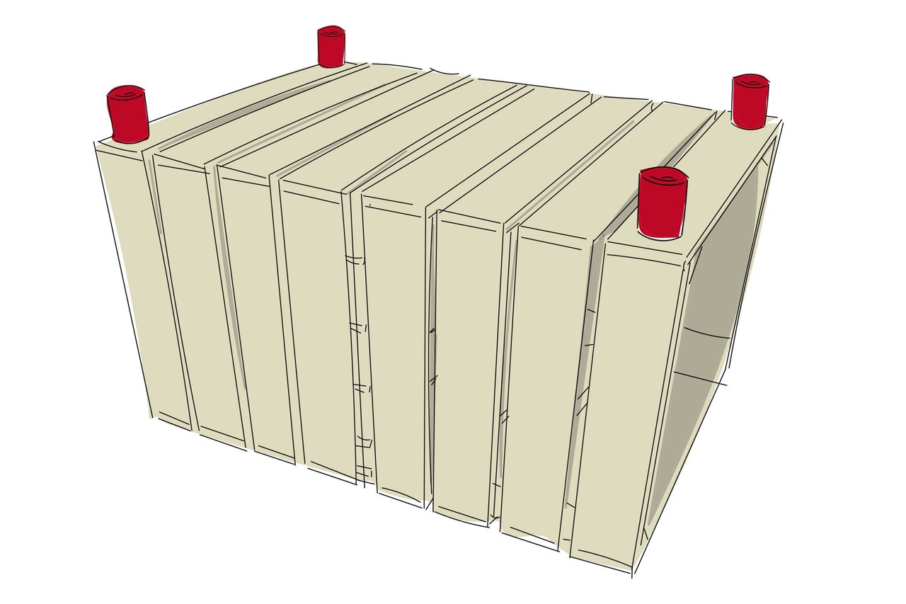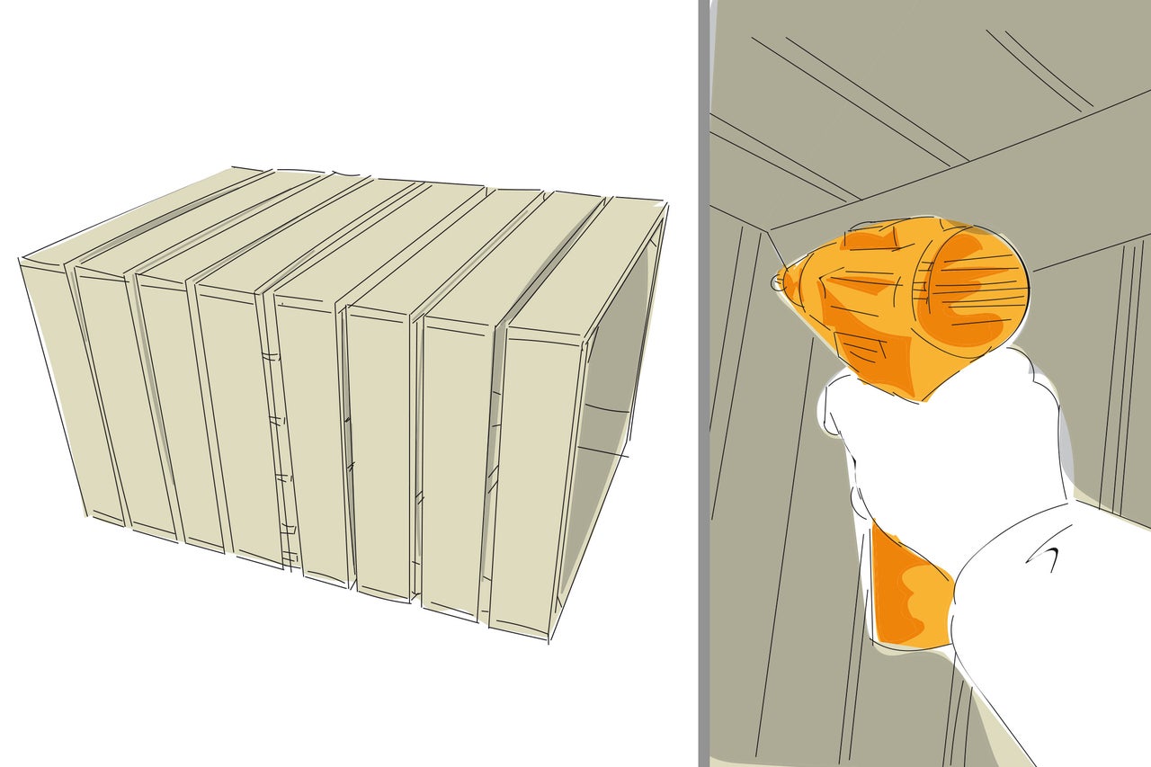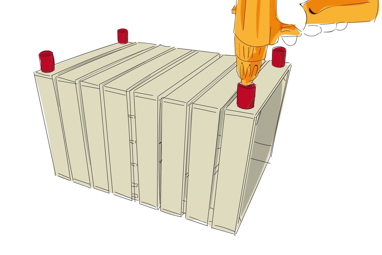 Schroef de beide kisten (280 x 330 x 440 mm) met de onderkanten aan elkaar vast. Schroef daarvoor vier schroeven (5,0 x 30 mm) van binnen door de voorgeboorde schroefgaten in de onderkant van de tweede kist vast.