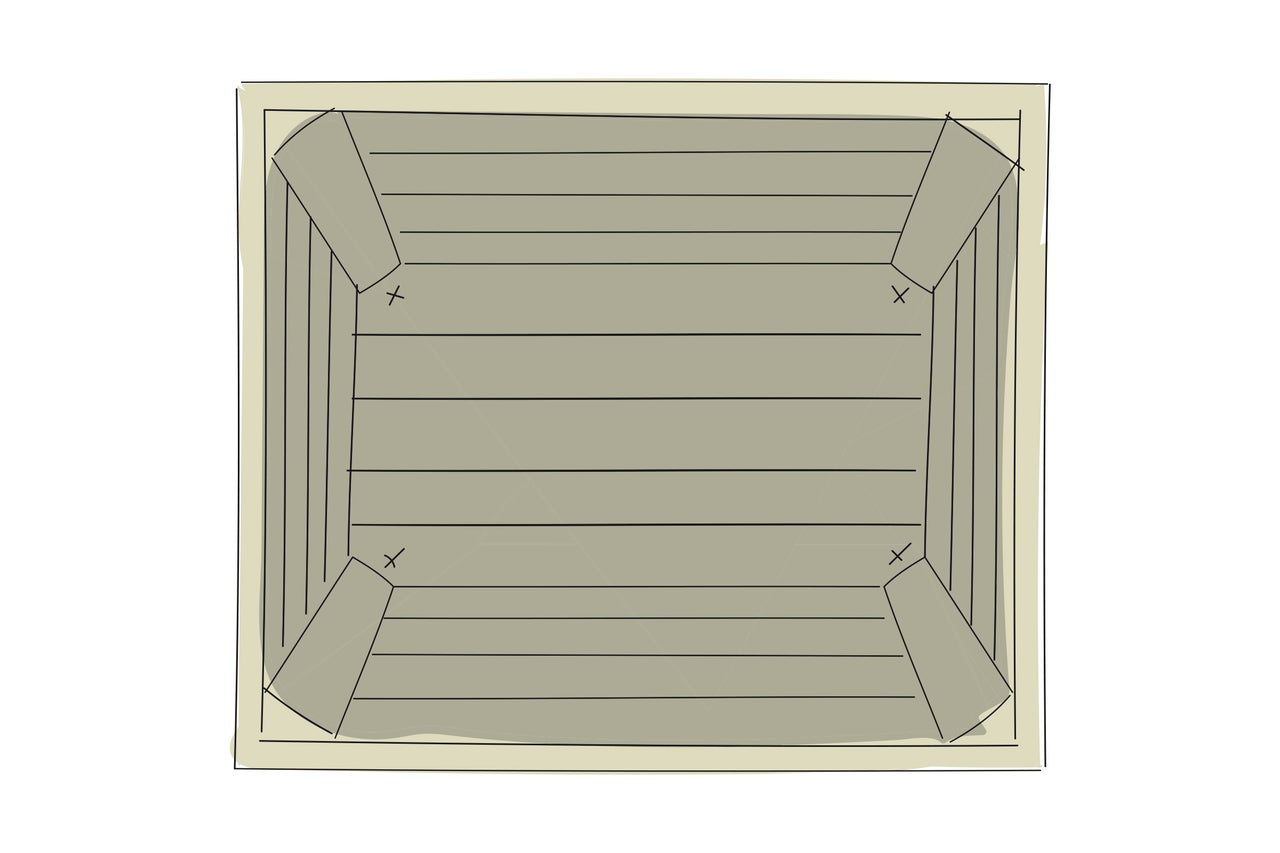 Boor in de bodem van een kist in iedere hoek met de verzinkboor een gat voor. Positie van de boorgaten: in het midden van het driehoekige hout, op een afstand van 5 mm.