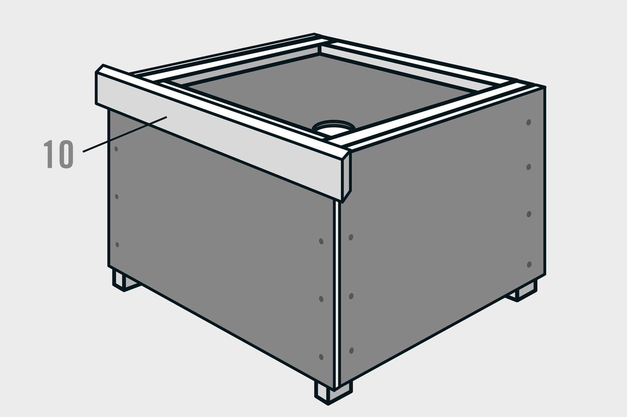 De framehouten (5) en (6) worden met de plaat (4) en de zijwanden (2) verlijmd - gebruik daarvoor water- en uv-bestendige montagelijm voor buiten. Houd je aan de gegevens over verwerking en uithardingstijd op het gegevensblad van de lijm. Laat de lijm uitharden. In de tussentijd kunnen de ruitvormige latten voor de bekleding van de zijwanden worden gezaagd (zonder afb.). De latten (7) voor de beide zijwanden zijn even lang. De latten (8) en (9) voor de voorkant en de latten (10) voor de achterkant bedekken de latten van de zijwanden.