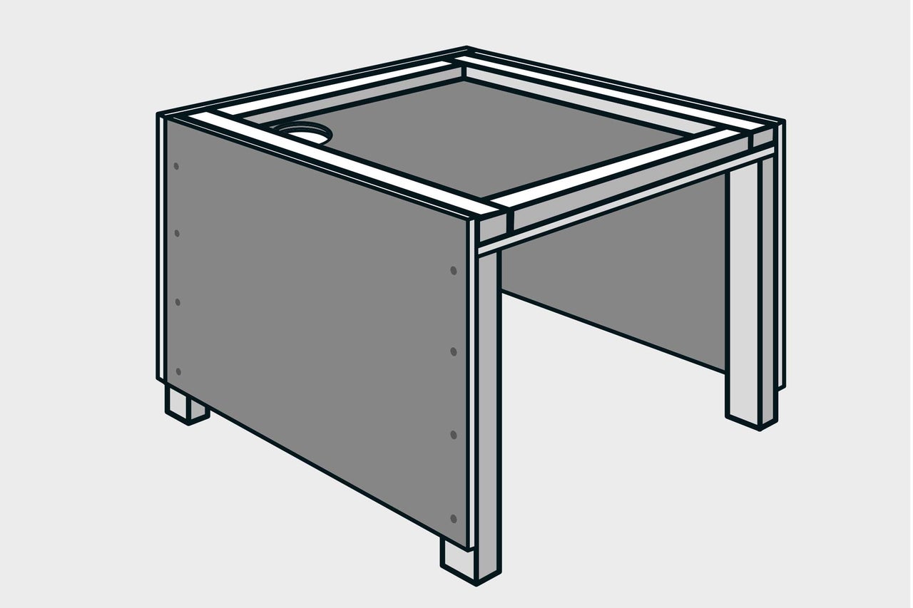 Op de plaat (4) wordt later de waterafvoer gemonteerd. Boor hiervoor een afvoeropening met een diameter van Ø 50 mm in de plaat, met een afstand van elk 80 mm tot de twee buitenranden. Boor vervolgens de schroefgaten voor met een diameter van Ø 4 mm, elk met een afstand van 20 mm tot de buitenranden. Zet de afgewerkte zijwanden met behulp van een assistent op. Richt de plaat (4) hier tussenin volledig flush met de balken (1) uit. Schroef de plaat vast met verzonken schroeven van 4,0x30 mm aan de balken.
