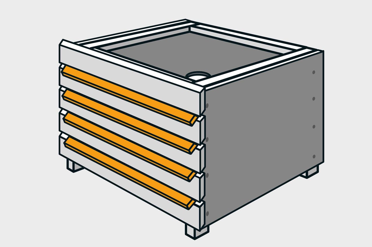 Bekleed de beide zijwanden volgens hetzelfde principe met de ruitvormige latten (7): bovenaan met 21 mm overhang, vooraan gelijk met de voorkant van de behuizing en op stoot met de latten van de achterwand (10).