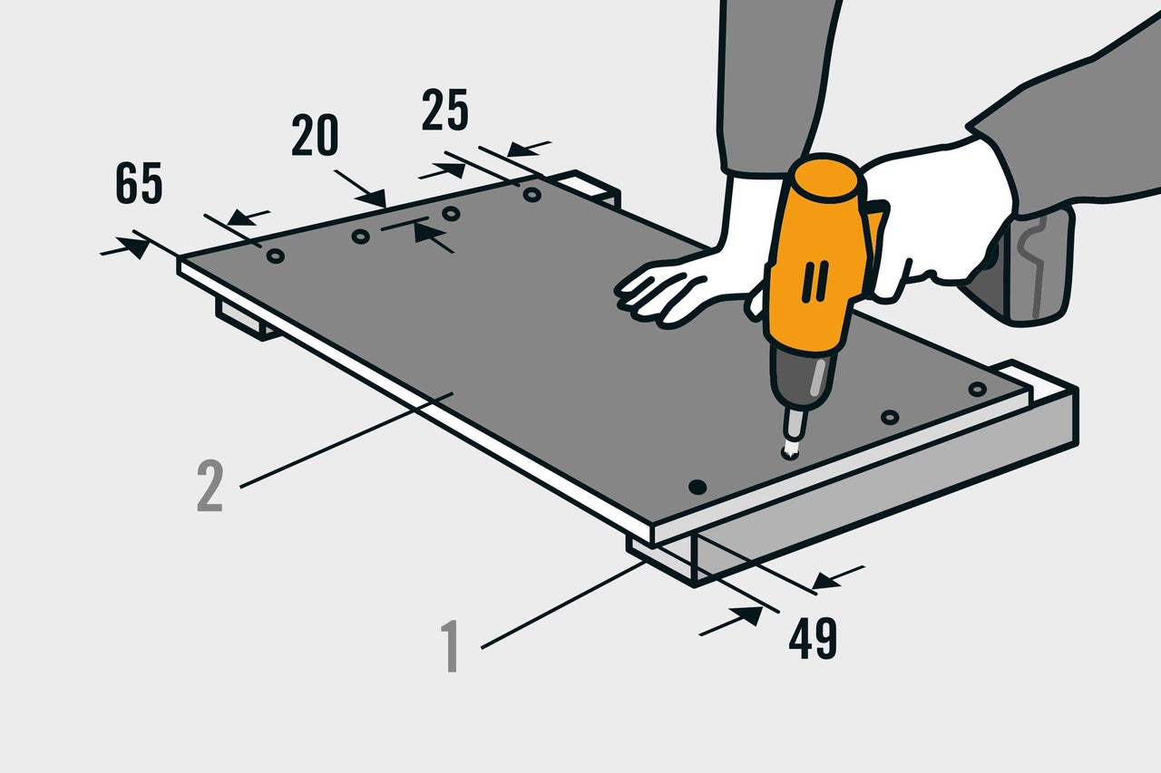 Bouw eerst de twee zijwanden. Boor hiervoor in beide platen (2) elk 4 schroefgaten aan elke smalle zijde met een diameter van 4 mm en met een afstand tot de rand van de korte zijden van 20 mm; de afstanden tot de rand van de lange zijden zijn respectievelijk 65 mm aan de ene kant en 25 mm aan de andere kant. Plaats de eerste plaat (2) buitenkant flush en met een verspringing van 47 mm op de vlakke zijde van de eerste twee balken (1). Schroef de plaat vast met verzonken schroeven van 4,0x30 mm aan de balken. Doe hetzelfde met de tweede plaat (2) en de overige twee balken (1).