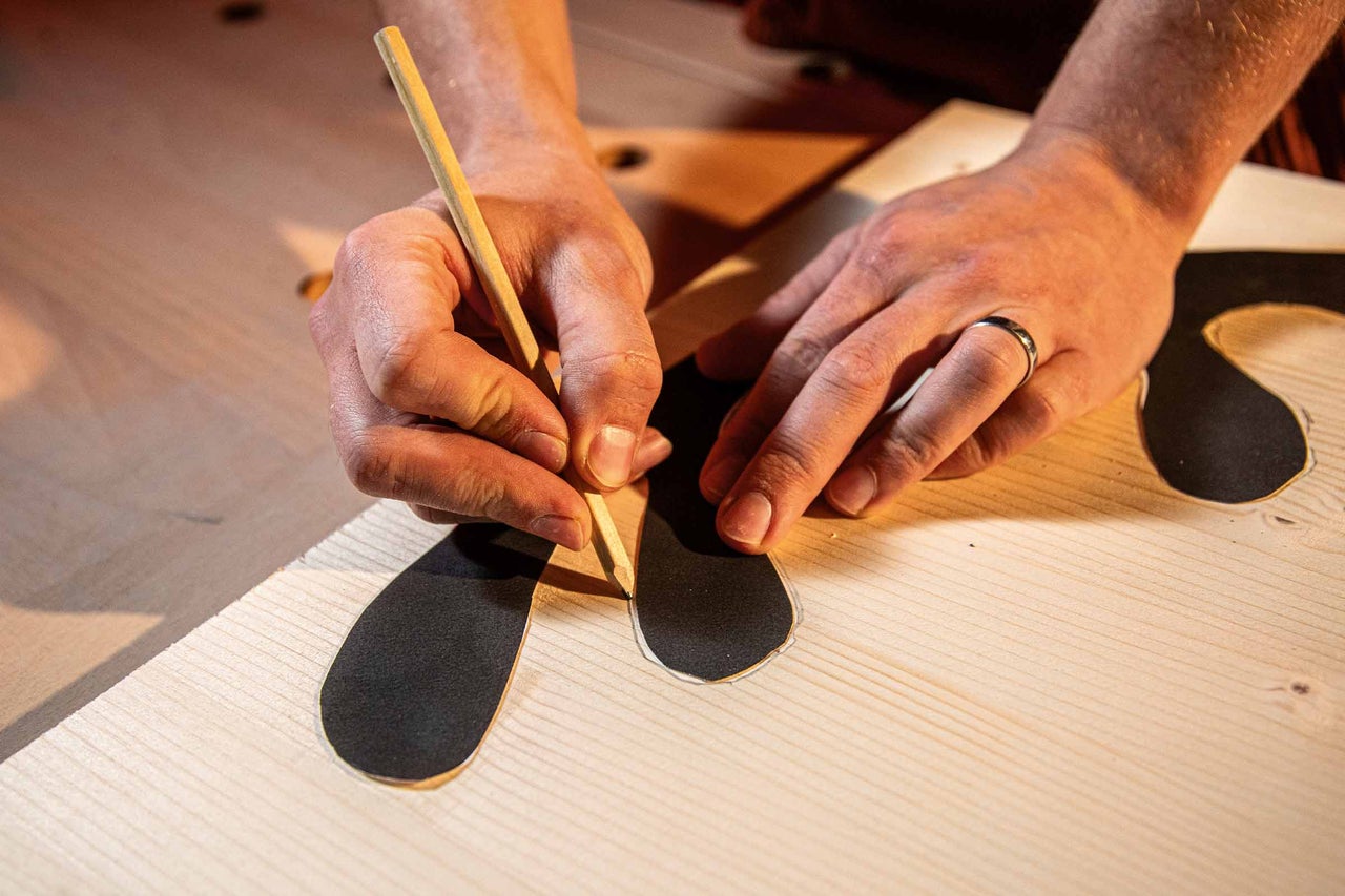 Leg de sjabloon op het hout en teken de vorm over. Let erop dat de uitsparing, waarmee het hoofd later op de schraag wordt geschoven, qua grootte bij jouw schraag past. Gebruik je de in deze handleiding voorgestelde schraag van HORNBACH, dan klopt het automatisch. Gebruik je een andere schraag, pas de uitsparing dan eventueel aan.