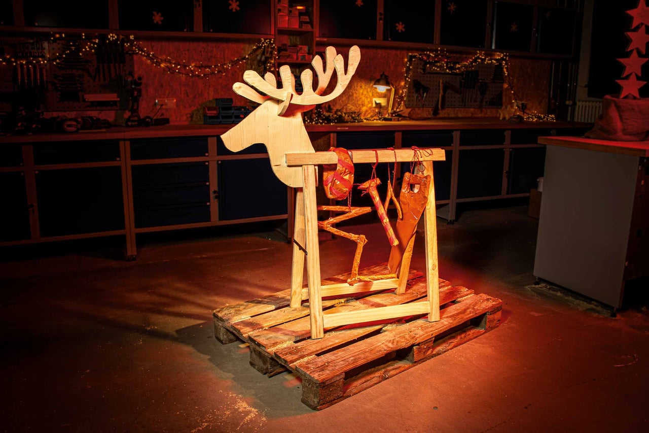 Steek alle onderdelen van het rendierhoofd in elkaar, schuif hem op de schraag en...