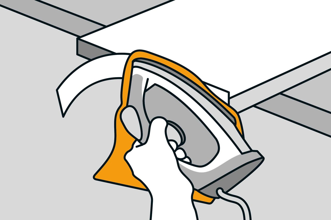 Werk de zaagkanten van de platen af met kantenband. Zo ziet je kast er strak uit. Snijd de kantband altijd iets breder en langer af dan de rand zelf. Laat het rondom een beetje uitsteken. Leg er een katoenen doek overheen en zet je strijkijzer op de hoogste stand. Vervolgens druk je de kantenband stevig op de rand. Laat de smeltlijm daarna volledig afkoelen zodat alles muurvast zit.