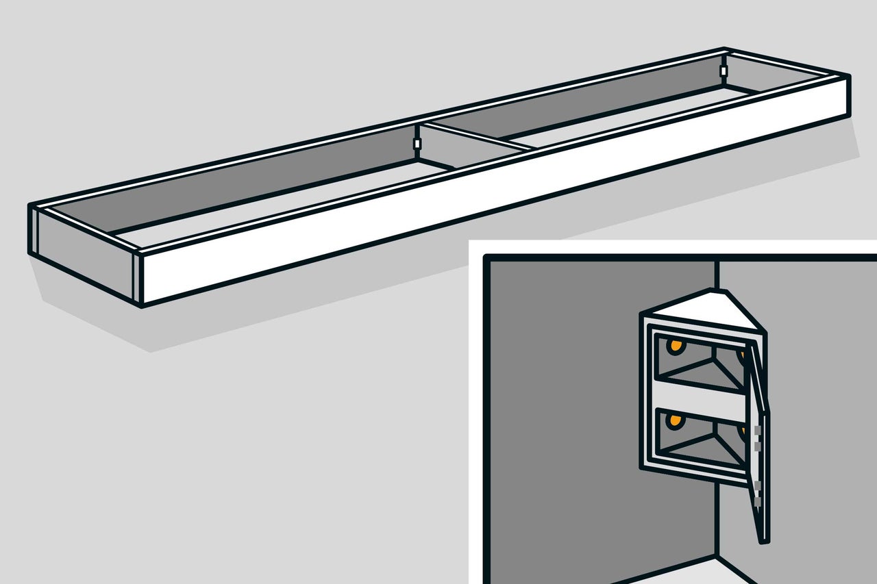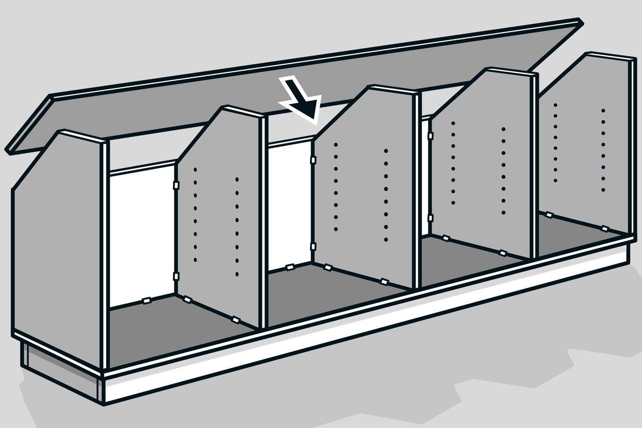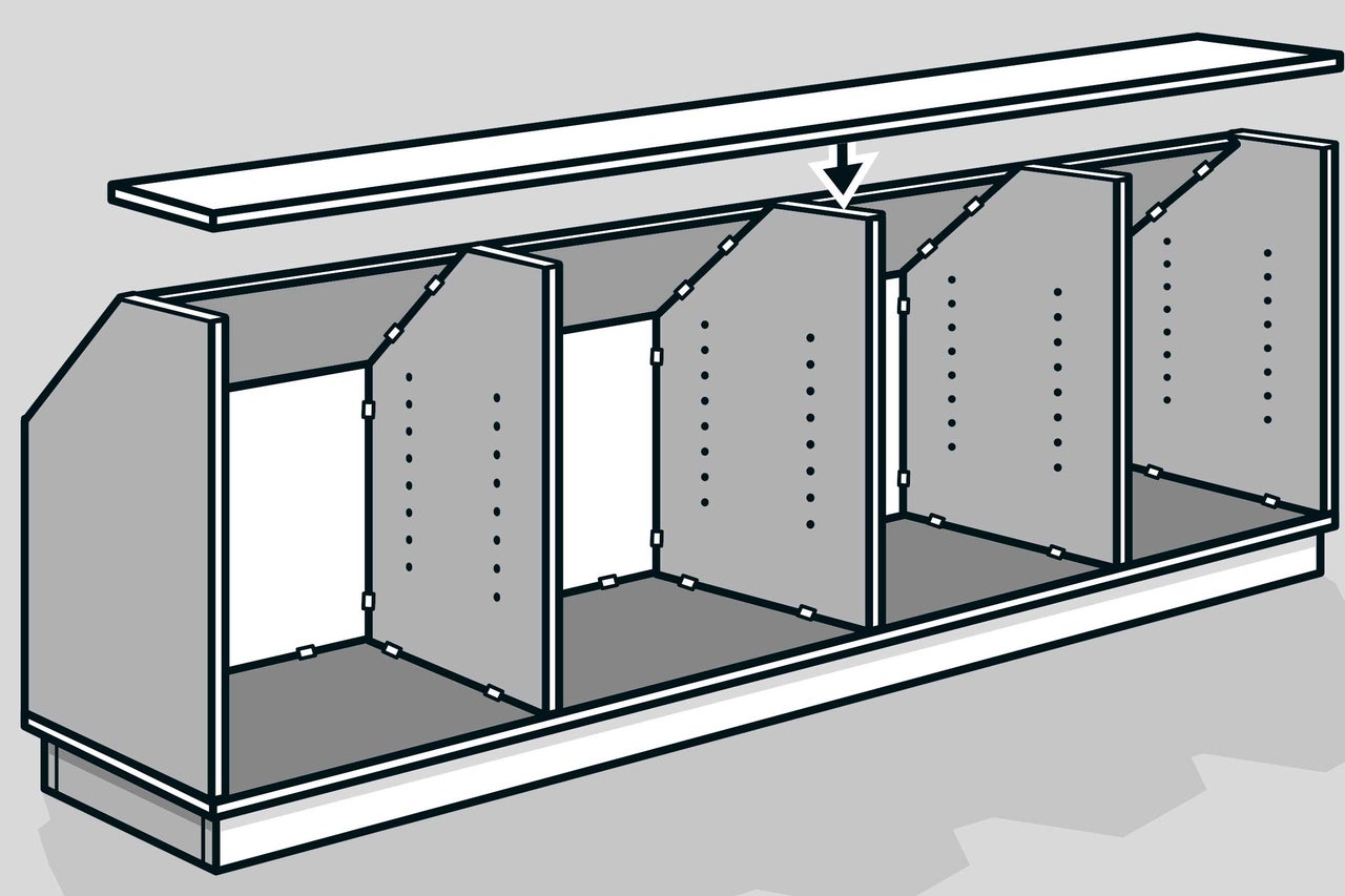 Lijn de bovenste afdekplaat zo uit dat hij achteraan netjes op de schuine afdekplaat rust. Monteer de plaat vervolgens met twee universele verbindingsstukken aan de zijwanden en tussenschotten. Gebruik je draaideuren? Dan sluit deze afdekplaat aan de voorkant mooi vlak aan op de tussenschotten.