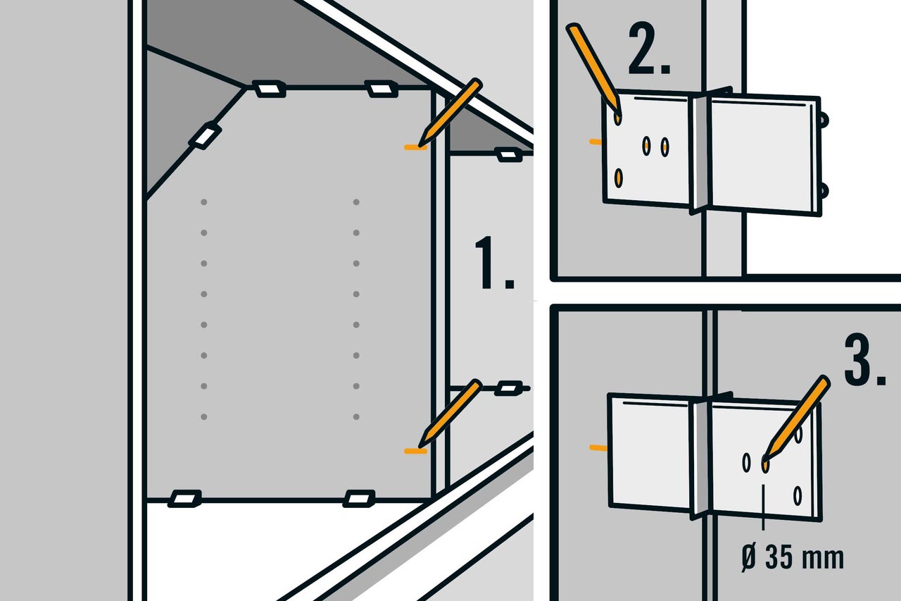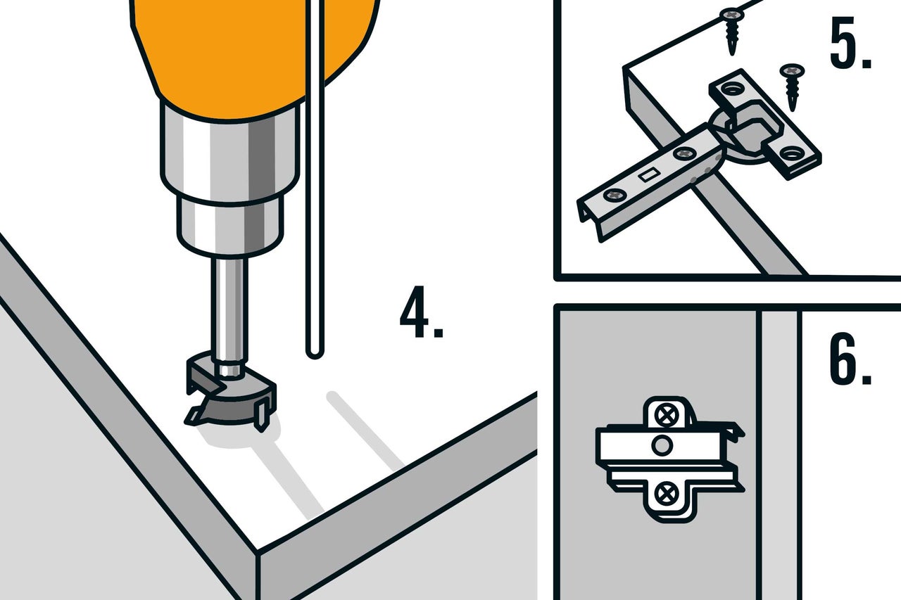 Meubeldeuren worden meestal gemonteerd met potscharnieren, net zoals bij keukenkastjes. Deze scharnieren bestaan in verschillende uitvoeringen. In dit voorbeeld worden de deuren vóór de kastconstructie geplaatst. Daarvoor heb je potscharnieren nodig die geschikt zijn voor montage tegen een middenwand.