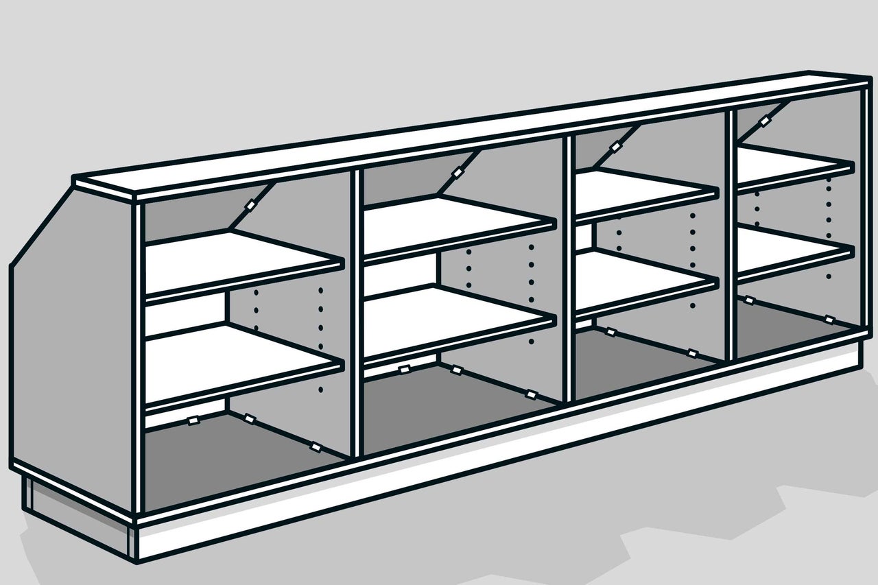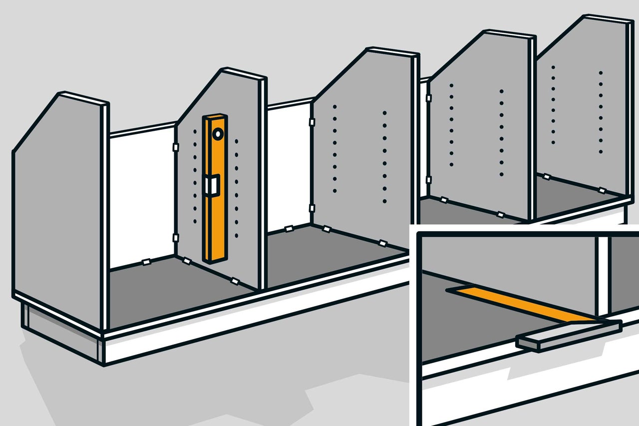 Monteer nu de tweede zijwand. De tussenschotten plaats je op gelijke afstanden, netjes rechtop en haaks op de bodemplaat. Schroef ze met universele verbindingsstukken vast aan de achterwand en de bodemplaat.