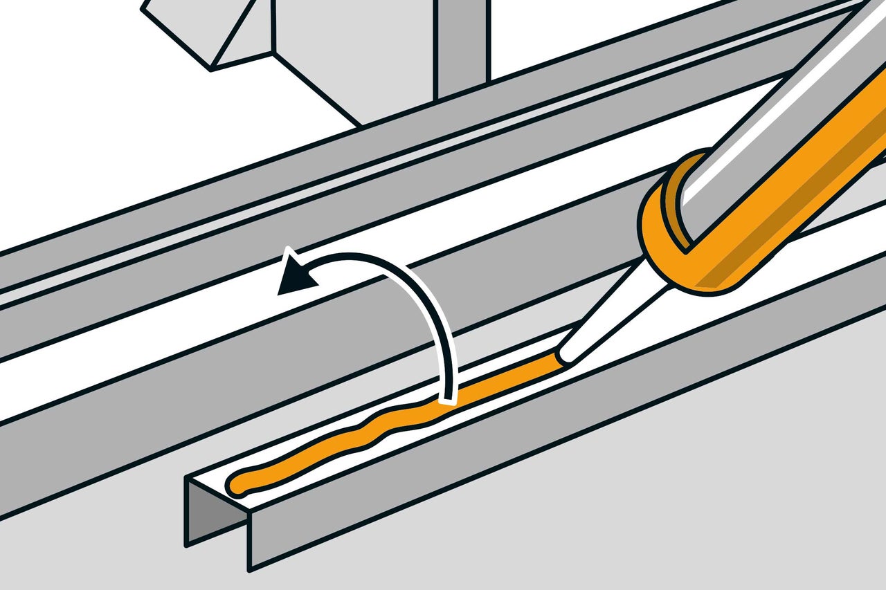 Boor in de twee bovenste profielen om de 30 cm gaten voor de schroeven. De twee onderste profielen lijm je met montagelijm parallel en strak tegen elkaar op de bodemplaat. Laat de lijm goed uitharden voordat je verder gaat.