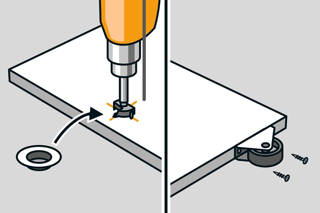 Begin met het monteren van de meubelgrepen, in dit voorbeeld zijn dat komgrepen. Boor de benodigde openingen met een Forstnerboor en steek de komgrepen erin. Volg hierbij altijd de instructies van de fabrikant, dan weet je zeker dat alles netjes past.