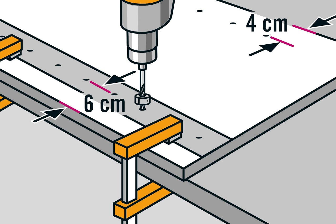 Boor in totaal 16 gaten, zo kun je altijd nog van plankhoogte wisselen. Boor de gaten met 6 cm afstand vanaf de achterkant en 4 cm vanaf de voorkant. Gebruik een boor met dieptestop, of maak zelf een markering met een stukje tape. Zo weet je zeker dat je nooit te diep boort en alles straks perfect past.