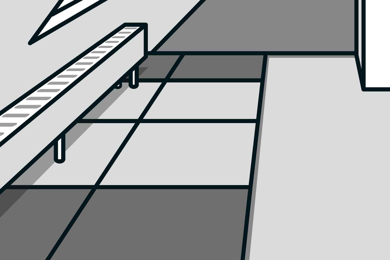 Leg de eerste rij tapijttegels precies langs de richtlijn. Zorg dat de tegels strak tegen elkaar liggen, zelfs een kleine afwijking in deze eerste rij kan later voor grote scheefstand zorgen. Neem dus de tijd om dit nauwkeurig te doen, het is de basis voor een strak eindresultaat.