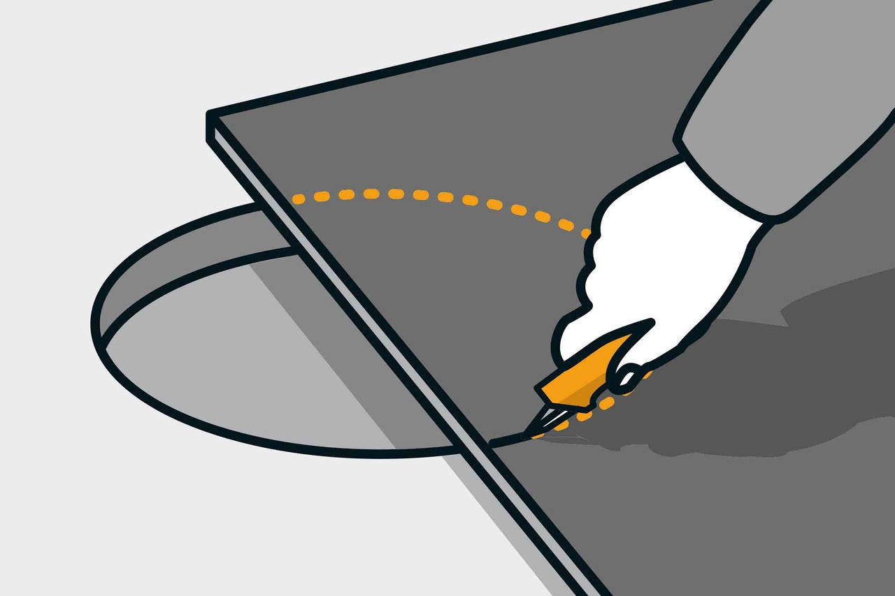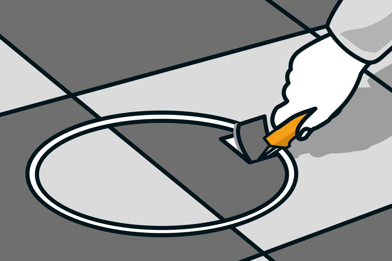 Zodra de tegels rondom het luik liggen, kun je het deksel terugplaatsen en gebruiken als snijmal. Plak tapijttape op de deksel en leg de tapijttegel erop, let goed op de poolrichting! Snijd de tegel nu nauwkeurig langs de binnenvorm, zodat hij perfect past.