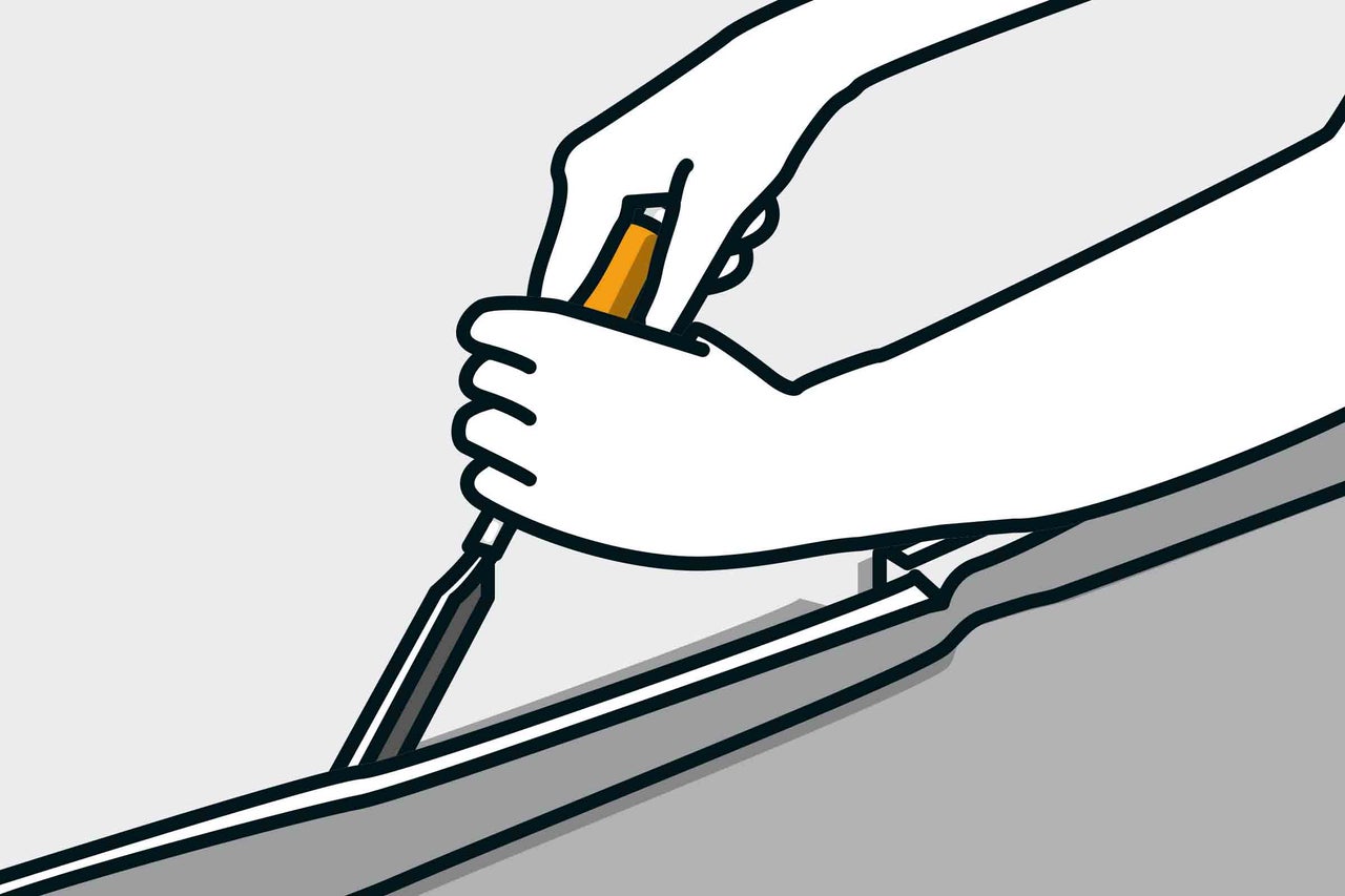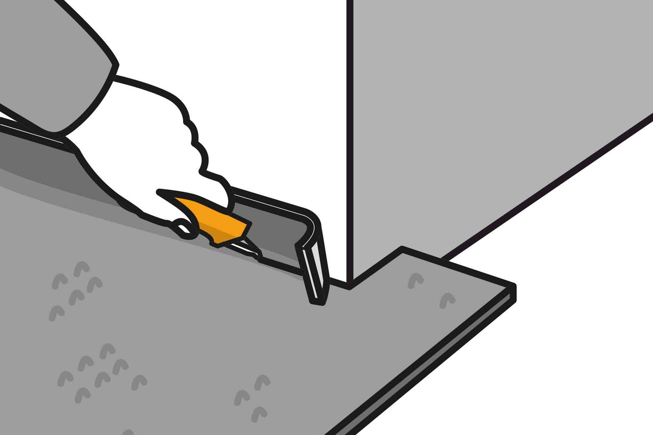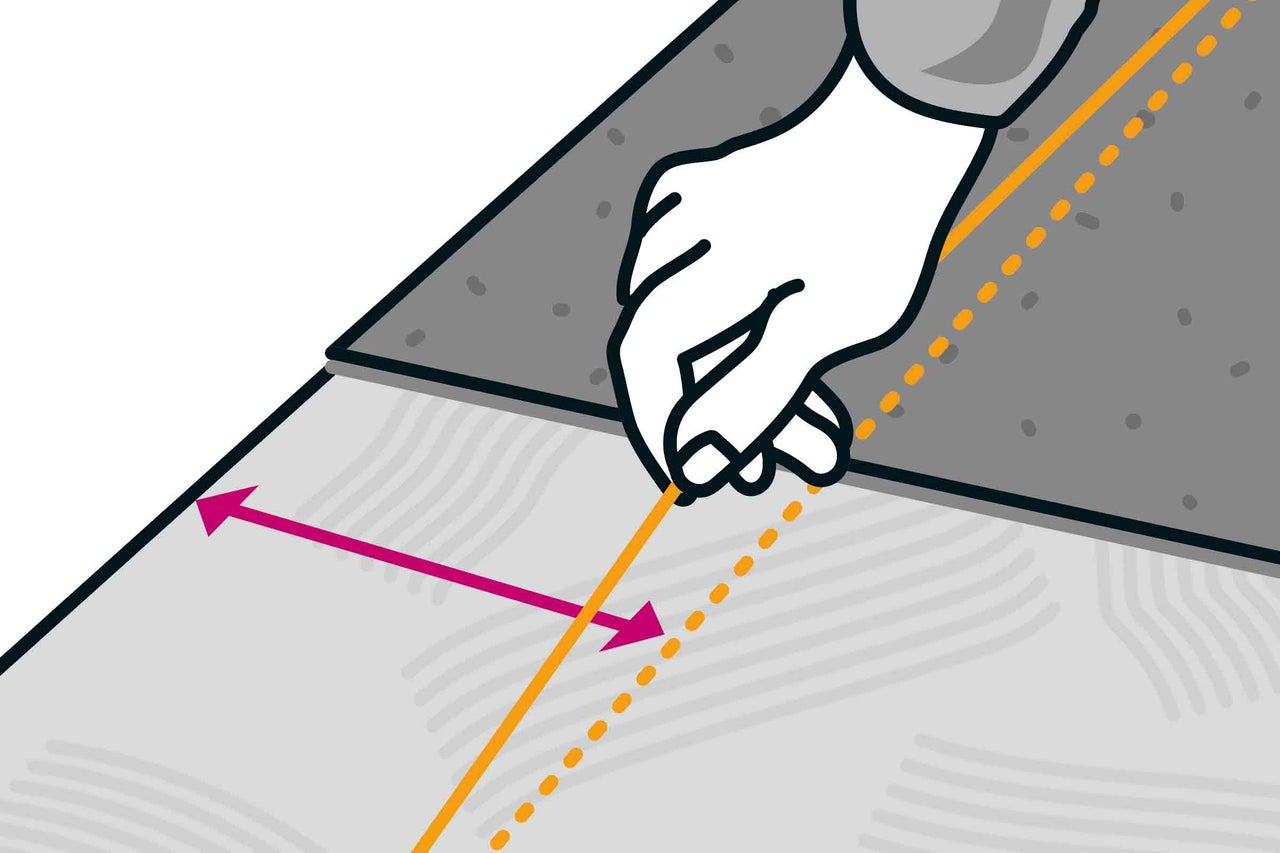 Druk eerst de uitstekende delen van de tapijttegel stevig tegen de muur aan, precies in de rand. Snijd daarna met een scherp zaagblad langs de rand van de tegel. Vouw het afgesneden stuk van de muur af en snijd het vervolgens helemaal door, zodat de tegel netjes op maat is.