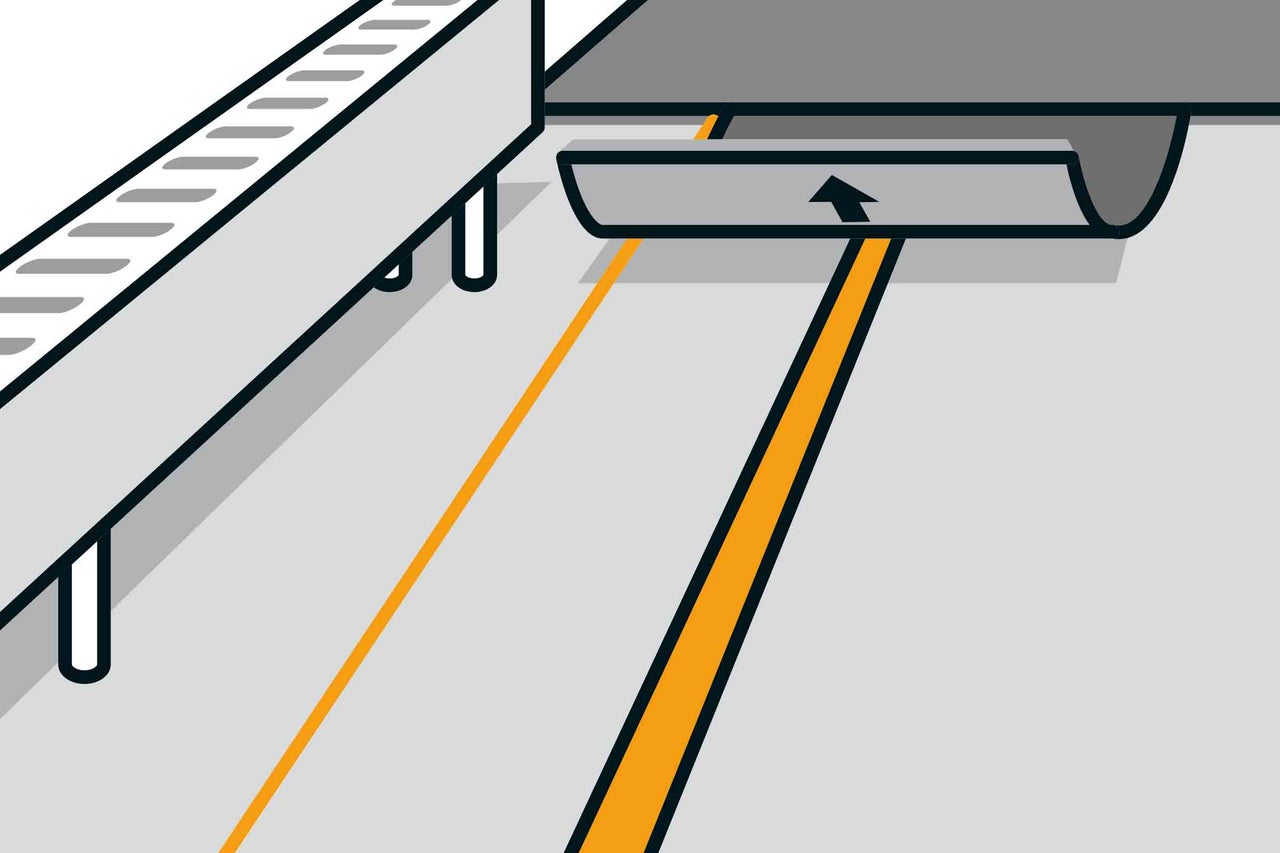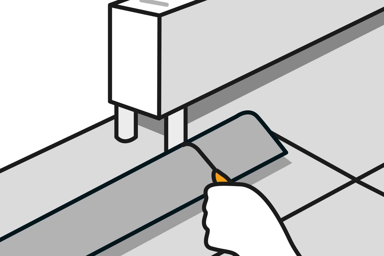 Vouw de tapijttegel bij radiatorbeugels of buizen omhoog en maak met een haakmes een rechte snede in de bovenlaag. Let op: snijd niet door het onderste deel van de tegel! Vouw de tegel daarna weer naar beneden op de vloer en knip hem netjes bij zodat hij precies om de buis past.